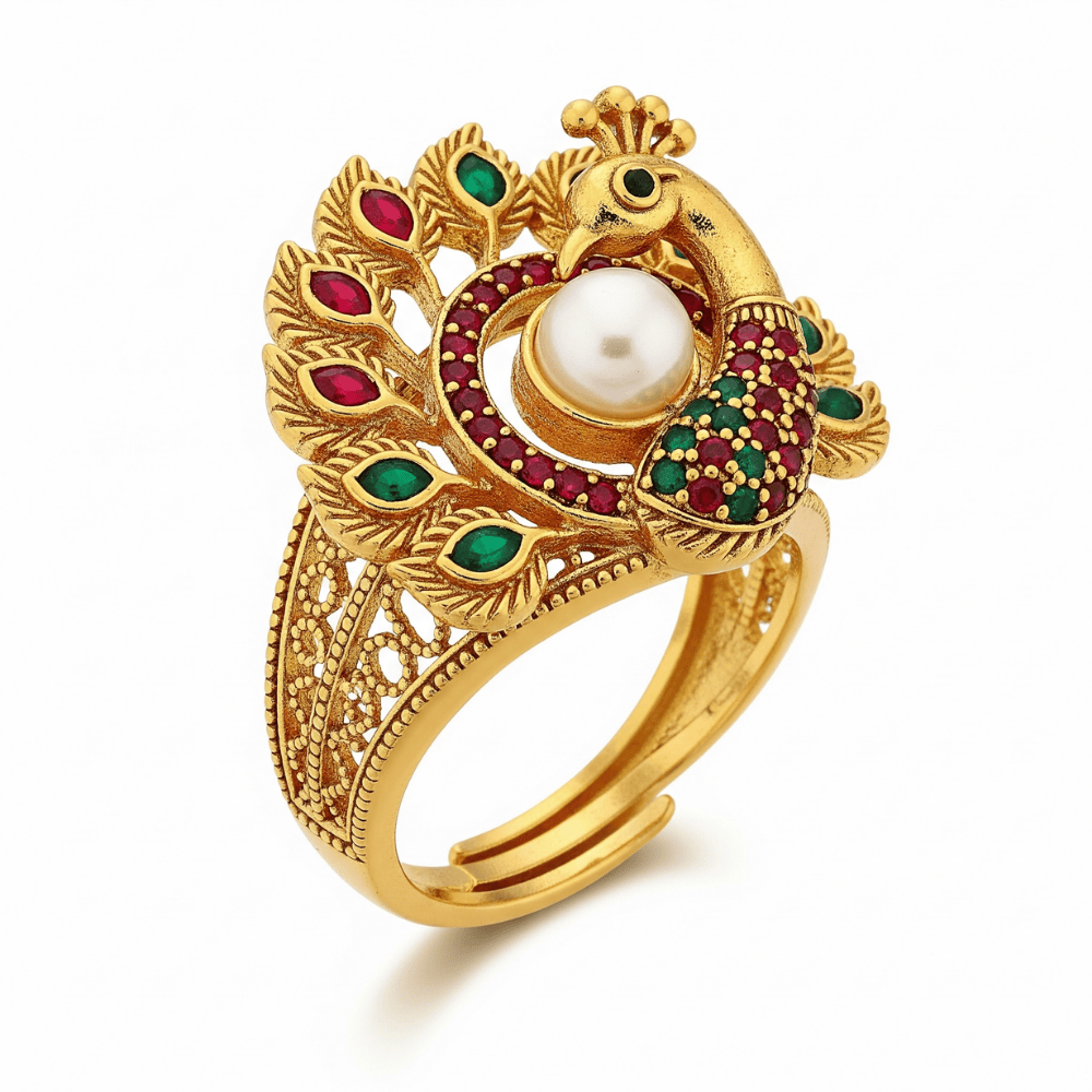 An exquisite adjustable ring featuring a classic peacock motif, crafted in 22k gold-plated silver and adorned with kempu stones and freshwater pearls.