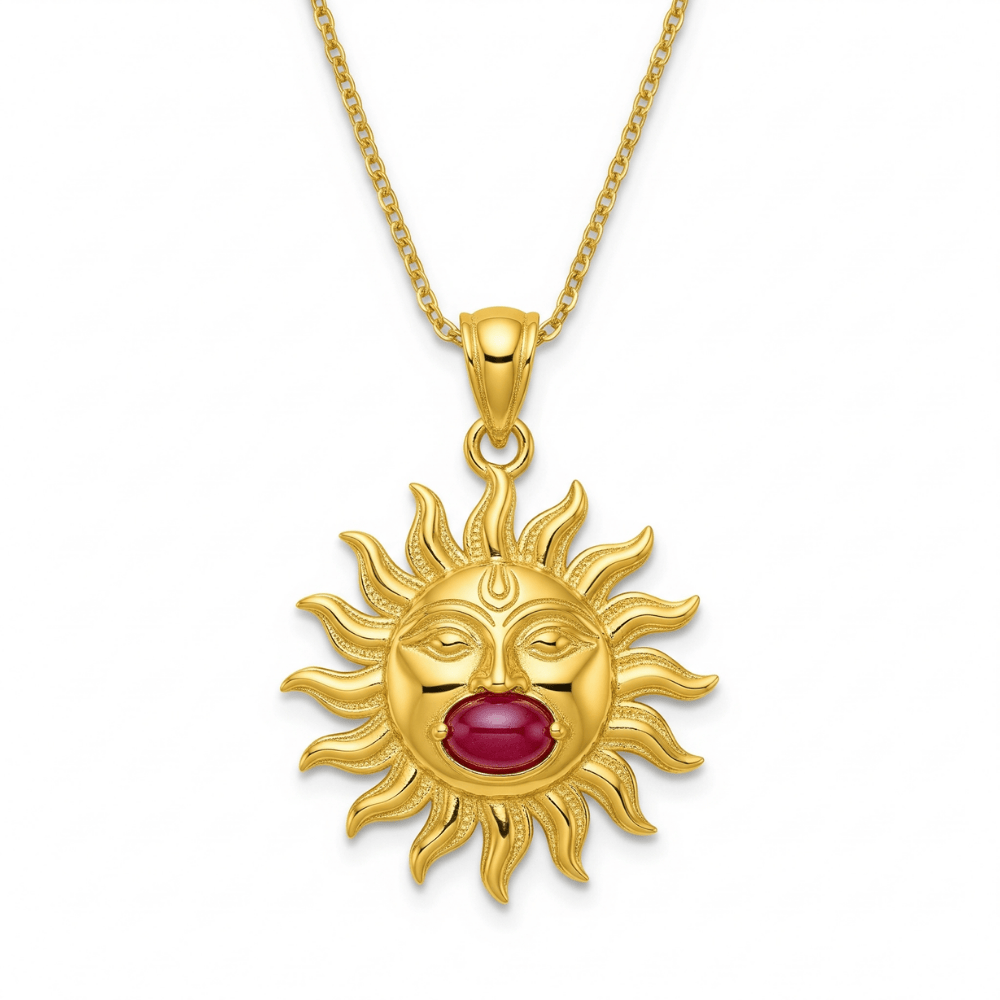 Invoke warmth and vitality with our Surya Pendant, a powerful homage to the Sun God. This intricate piece is crafted from sterling silver with a lustrous 22k gold plating, featuring detailed rays that emanate from a central, deep-red ruby. Symbolizing life and energy, this pendant is a meaningful accessory that adds a touch of divine elegance to any chain. It’s a perfect blend of spiritual significance and masterful craftsmanship.